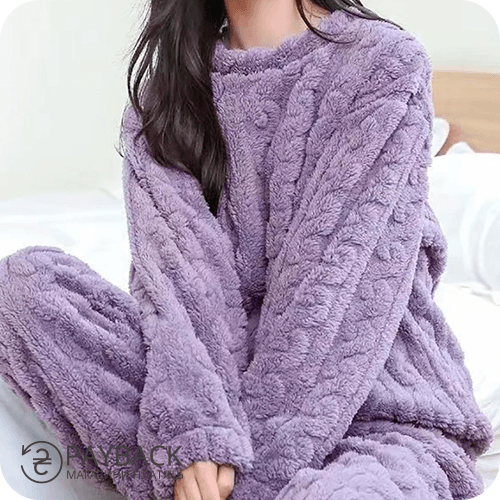 Цей осінній жіночий комплект піжами поєднує практичність і комфорт у щоденному носінні. М’який оксамитовий матеріал з щільного флісу зігріває у прохолодні дні, а в’язаний крій додає текстури та стильності. Класичний круглий виріз і довгі рукави забезпечують затишок, а штани роблять образ завершеним і максимально зручним для дому.